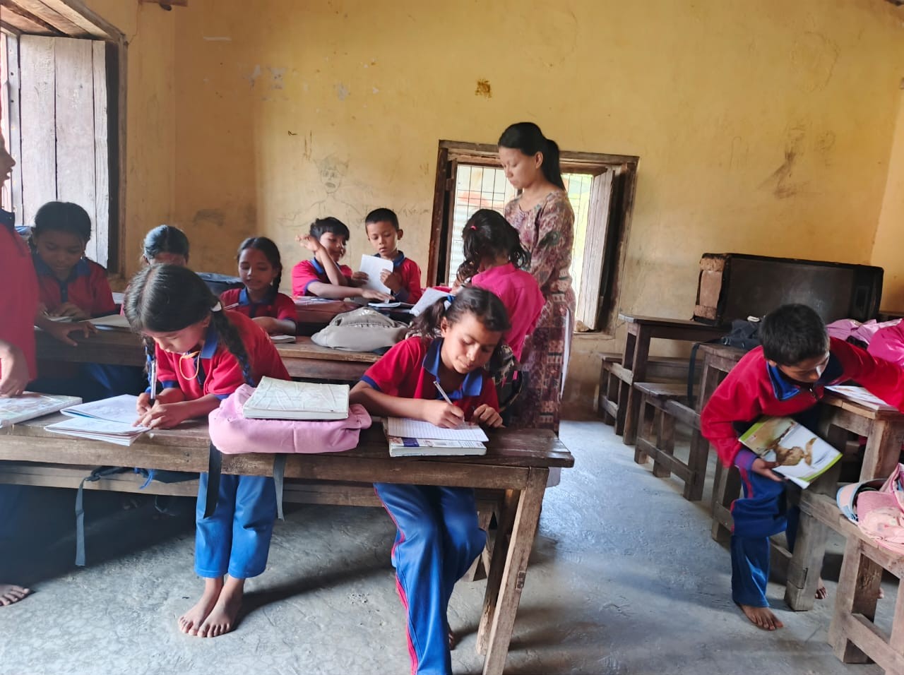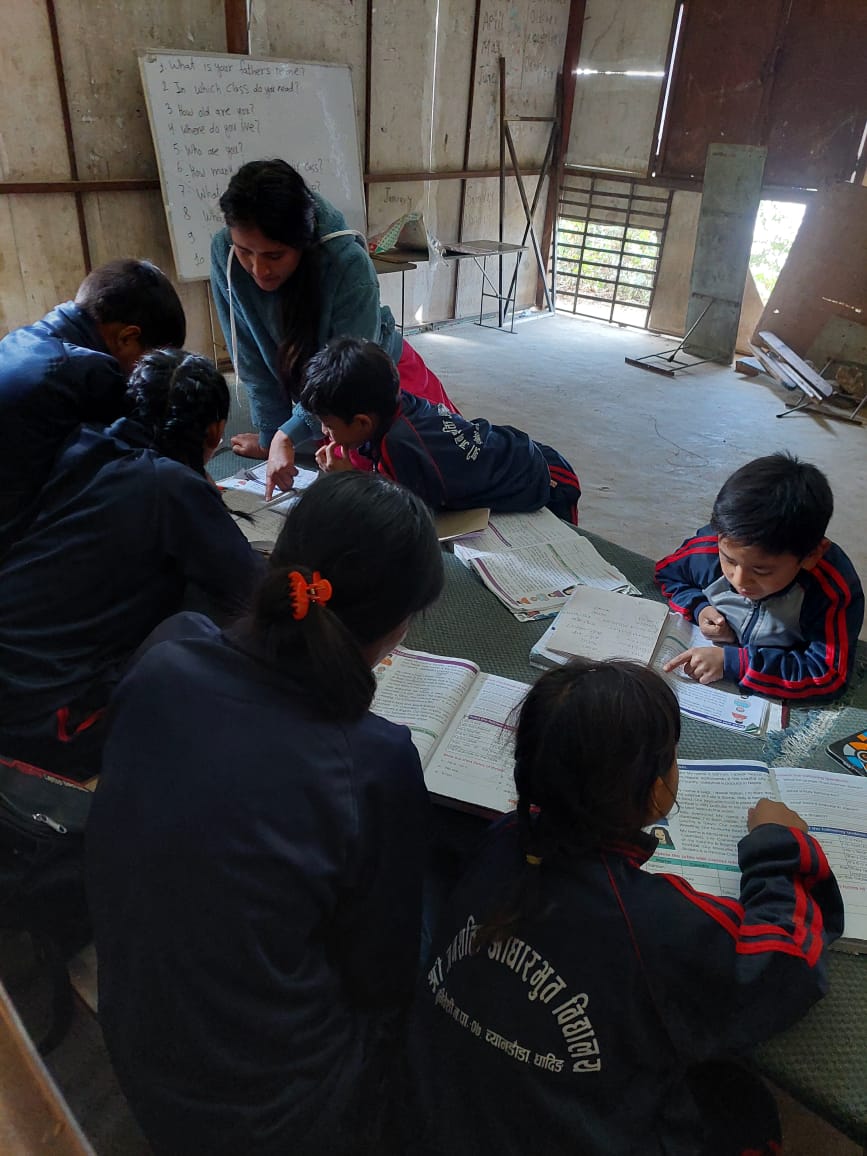 This center serves 22 students from the marginalized Baadi community across three different grade levels. Facilitator Radha Pariyar is helping the children with their homework. The program is running smoothly.